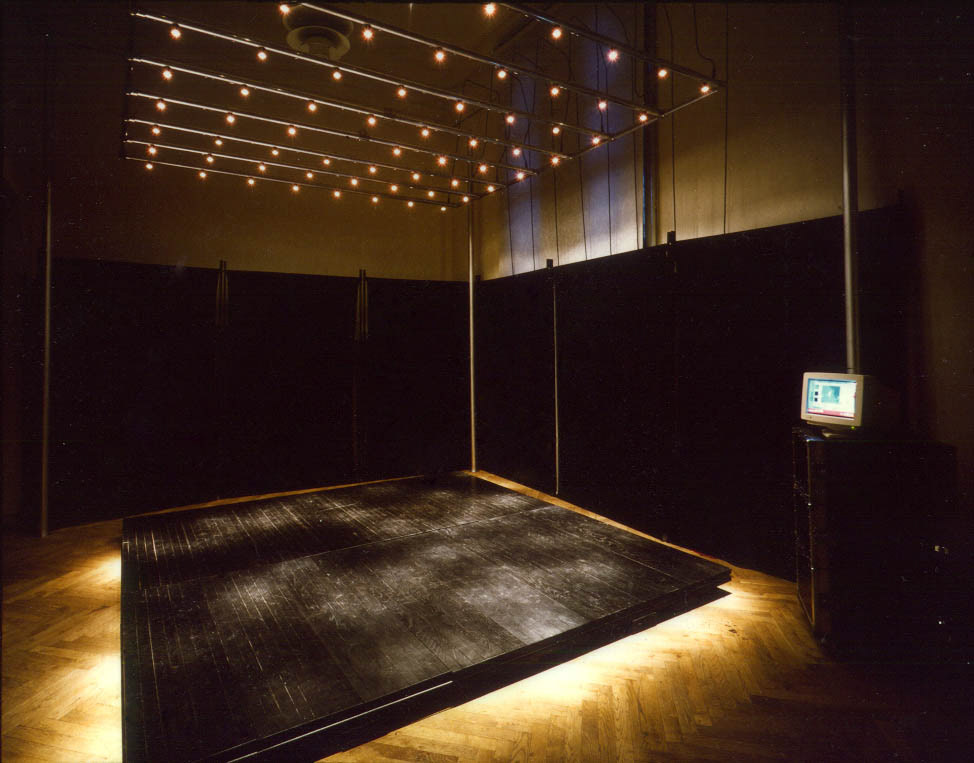 Movements by visitors on the black floor trigger and control electronic sounds.